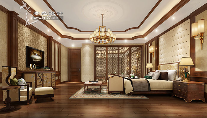 設計師運用了大量木作線條造型作為整體的裝飾,整個空間用材有大理石、實木地板、中式隔斷造型等設計元素,充分展示了時尚、典雅而富有生活氣息的特性。