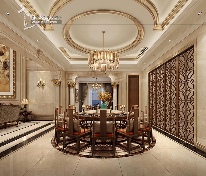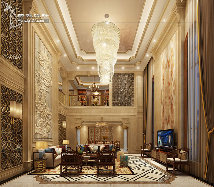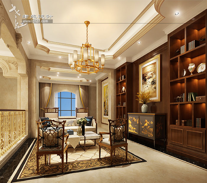 挑高的客廳空間里,歐式的造型,貴族的華貴,搭配著中式的深色木質家具,富有文化深蘊,亦中亦西,打造出一個富有韻味又時尚精致的溫馨空間??臻g格調華貴,質感十足。